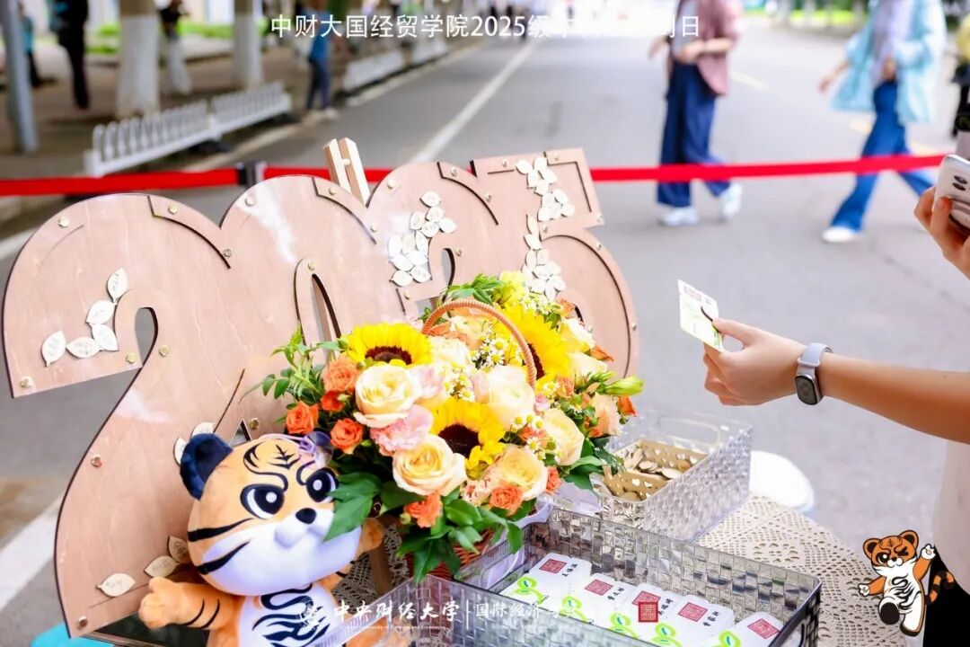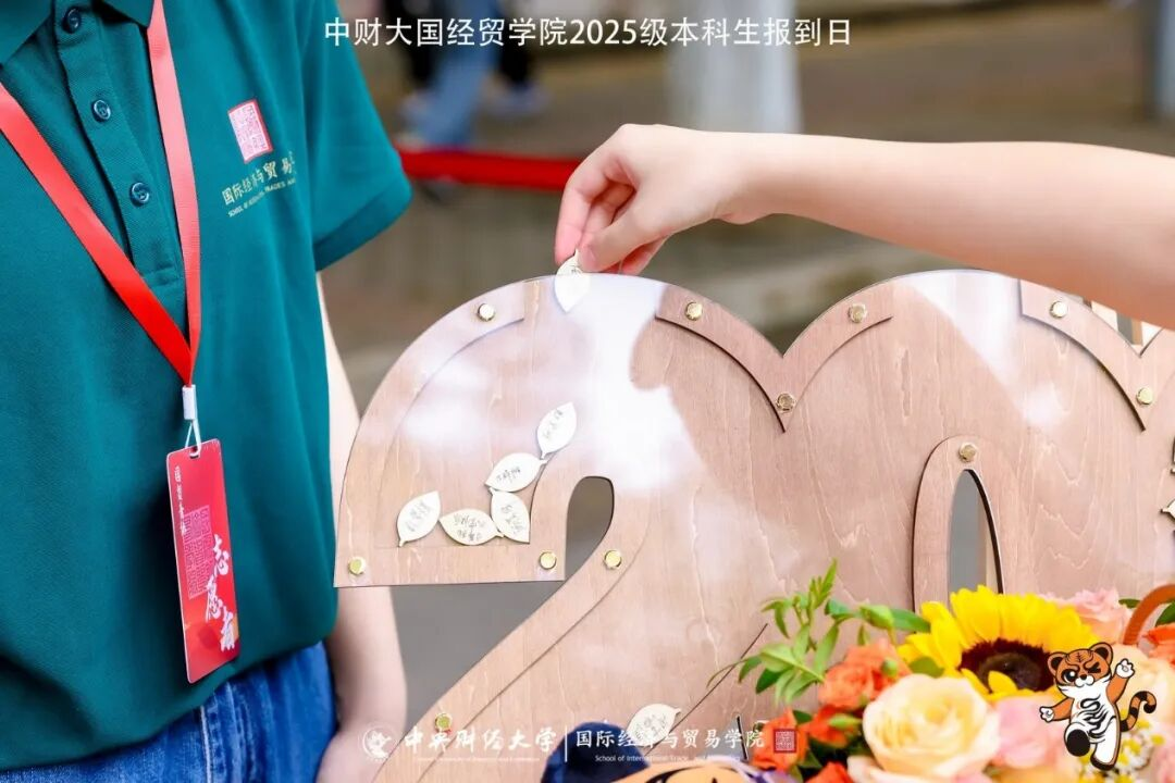 此次迎新,学院特意为新生同学们准备了迎新纪念礼物。志愿者们赠予新生印有国贸学院吉祥物贸贸虎的帆布袋、精致的学院徽章、玲珑的贸贸虎钥匙扣、学院特别编制的《茂才易学,四季耕读:3044AM永利集团本科生分年级发展指南》,以及印有新生名字的“种子门票”。“种子门票”放入泥土中可抽芽生枝,预示着梦想的种子将在国贸学院的沃土中生根发芽。新生将带着美好的祝愿,踏上大学之旅。此外,新生们在木刻叶片上签名,投入形为“2025”的透明容器。国贸学院似一棵大树,新生是一片片叶,从大树中获得养分,也为大树装点容貌。
