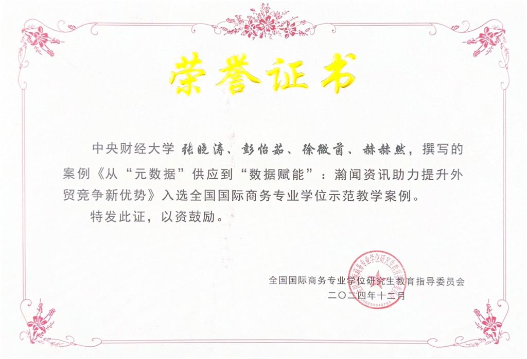 项目团队构建“校企共研、师生共创”的案例开发机制,项目团队成员在瀚闻资讯完成驻点调研和实习实训,调研内容涵盖企业业务模式、技术优势及数据赋能机制等,形成兼具理论价值与实践意义的系列成果,开发完成三篇教学型案例。案例严格遵循了《中国专业学位案例中心案例收录规范》,确保了内容的准确性和格式的规范性。三篇案例呈递进式逻辑,体现了规范性与系统性的统一。其中,《从“元数据”供应到“数据赋能”:瀚闻资讯助力提升外贸竞争新优势》入选全国国际商务教育指导委员示范教学案例;《大数据赋能出海,打造竞争新优势》荣获第三届国际商务专业学位研究生案例竞赛一等奖。