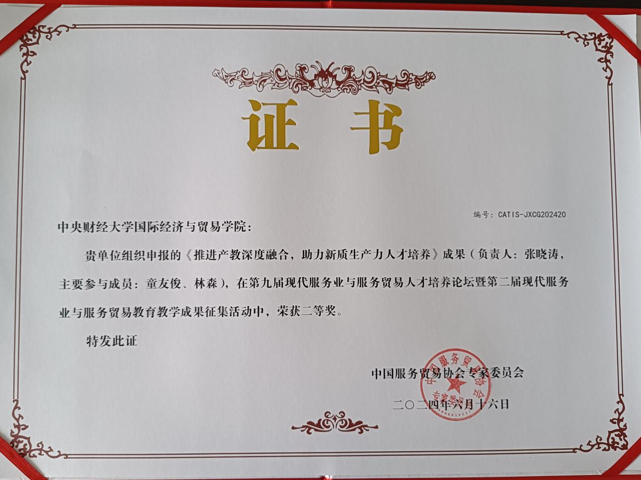 第九届现代服务业与服务贸易人才培养论坛获奖证书