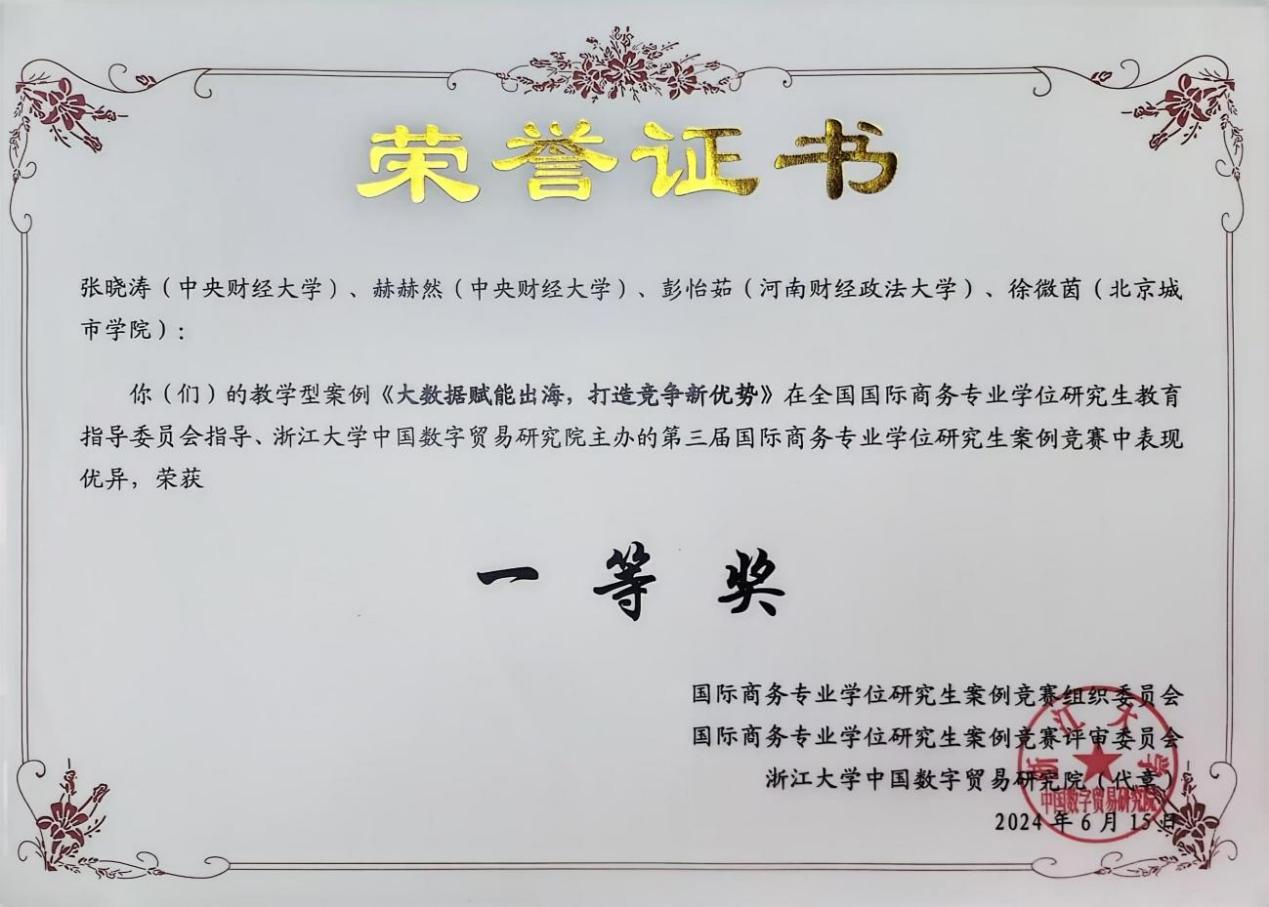 第三届国际商务专业学位研究生案例竞赛获奖证书