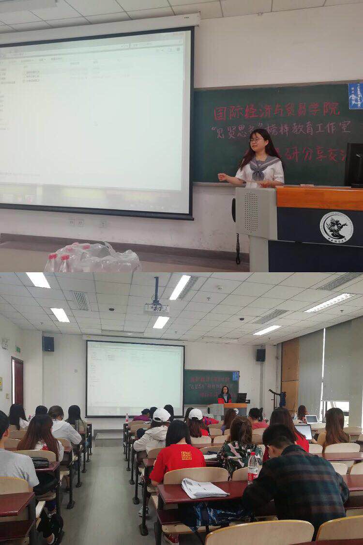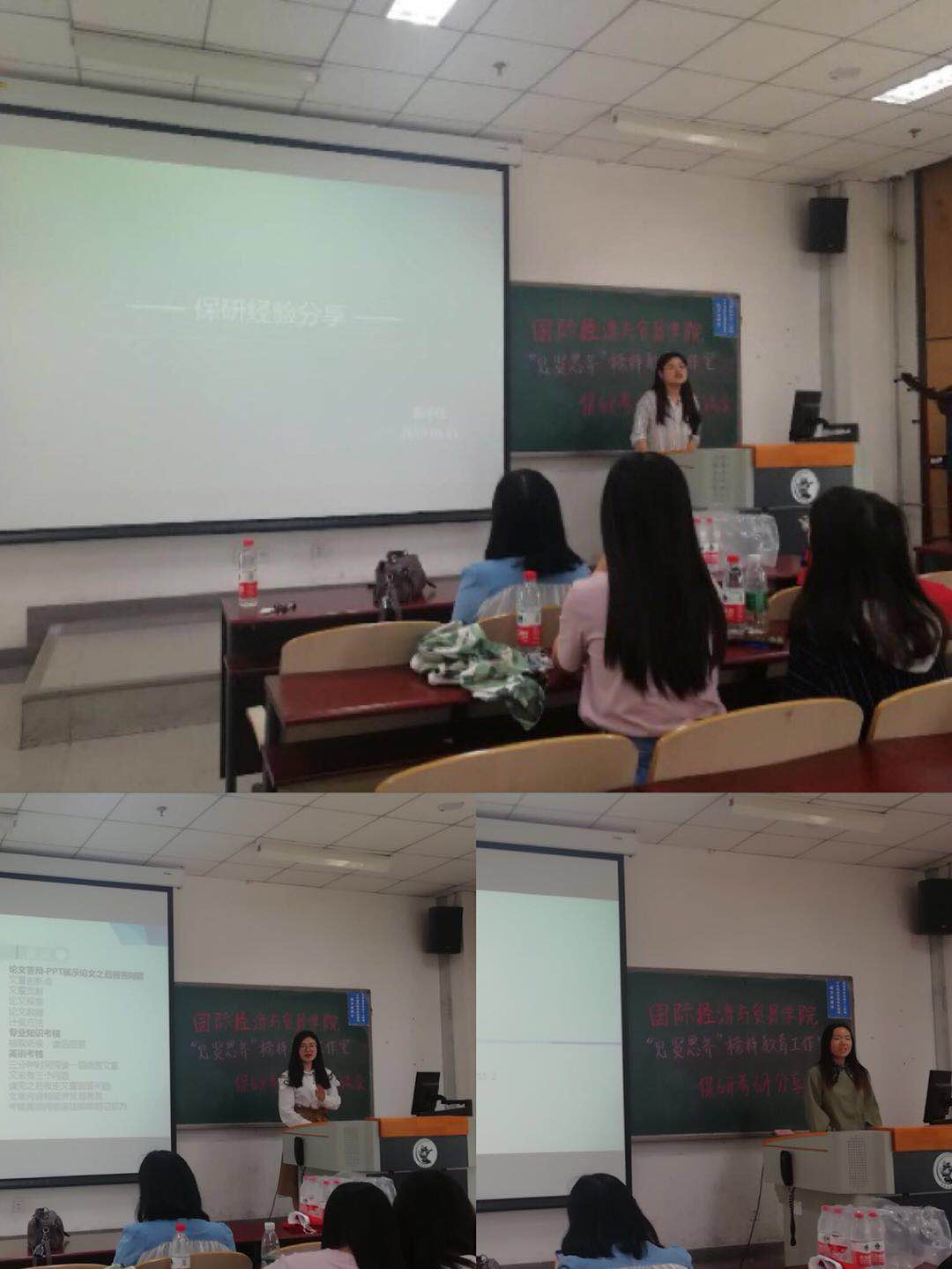 首先由学工办主任兼15级辅导员邱小花老师上台为同学们展示并分析了15级国贸学院各班学长学姐们的保研和考研的结果,可以看出国贸学院保研清北人大的人数不在少数,但各个班的考研成功率不容乐观。